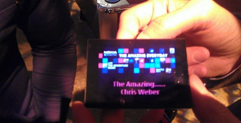 Get your salt out, ladies and gentlemen, because although this device may well be a real-deal object set for the 2012 event already set in place by Nokia for CES, it's also only appearing in a single photo which very well could have been doctored to look like an attempt by Mr Blurrycam at capturing a unique glace for himself. The story that goes along with the image you're about to see is that someone at Boored@Work got Nokia's Chris Weber to show off a piece of the "Amazing Everyday" event early: this piece being a business card sized device made by Nokia and set to bust apart the idea that your smartphone is the only device you need.