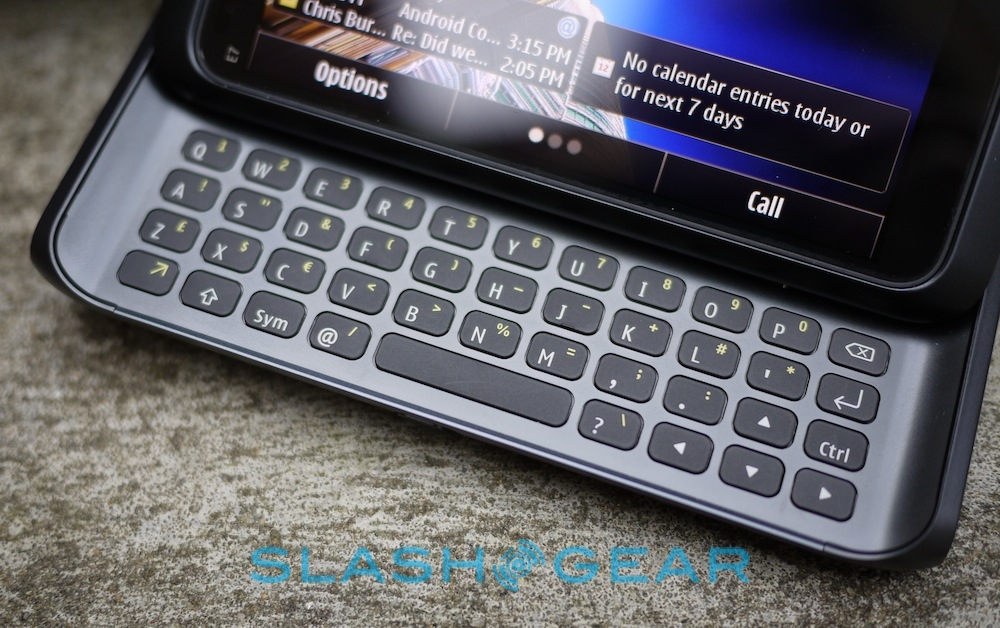 We had high hopes for the E7's 'board after Nokia World 2010, even having only played with the prototypes the company brought to the show, and the production models don't disappoint. A nudge at the left edge pops the spring-loaded display open with a pleasing thunk, tilted at a useful angle. The keys themselves consist of four rows of slightly domed, hard backlit buttons, with a broad spacebar and dedicated @ and arrows. Numbers share the top row of letters, triggered with the function key.