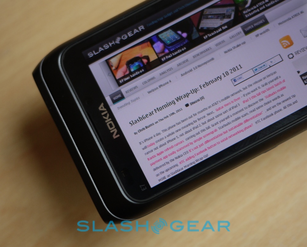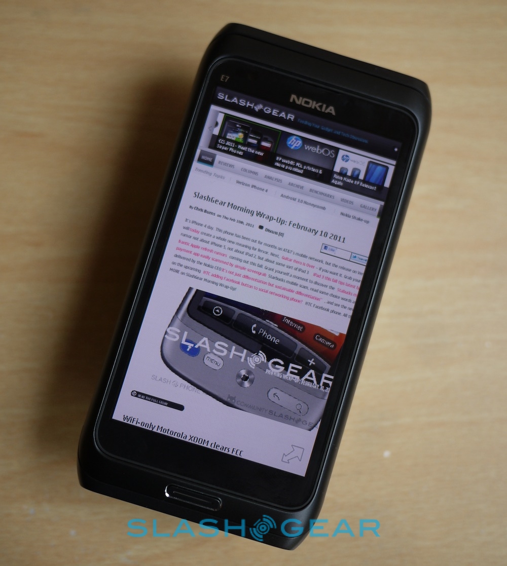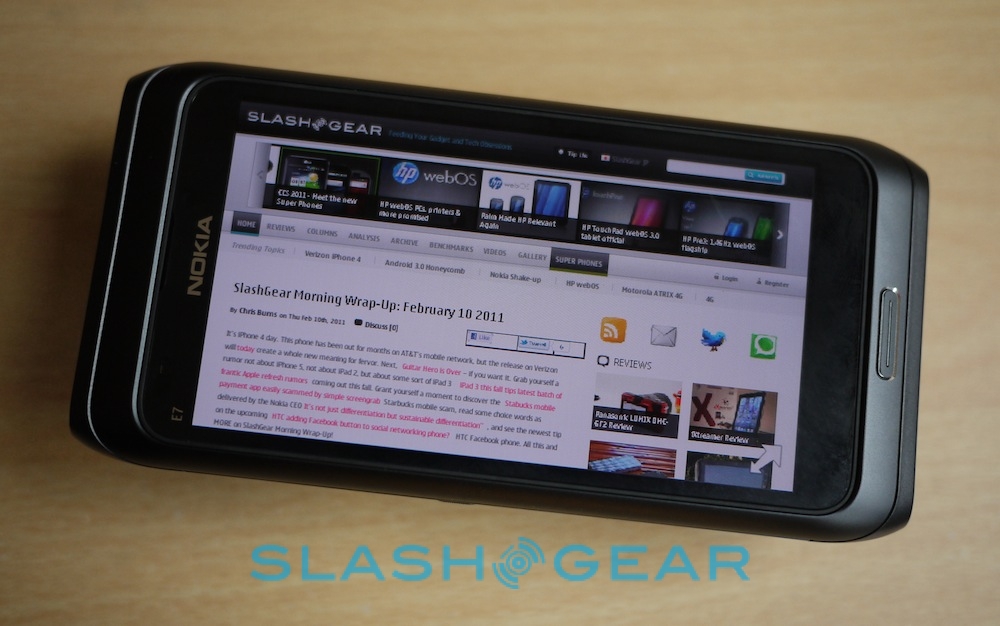 Nokia's native browser is also due for an overhaul, useful since right now it's outclassed by rival devices. There's Flash Lite 4 support (for most Flash Player 10.1 content), which is welcome, but there's no text-reflowing on zoom which makes for plenty of pinch-zooming or panning if you want to read blocks of text. The relatively low screen resolution also makes its presence known; where on rival devices with similar-sized displays you can often read text at low levels of zoom, the E7's 640 x 360 simply lacks the pixels for that degree of crispness.