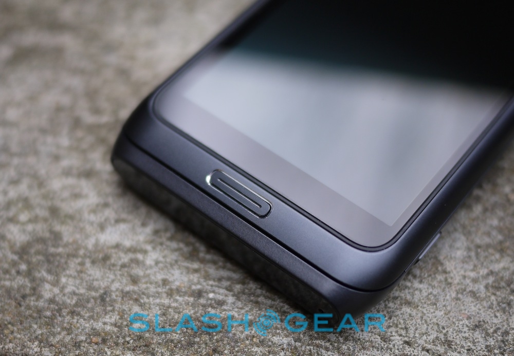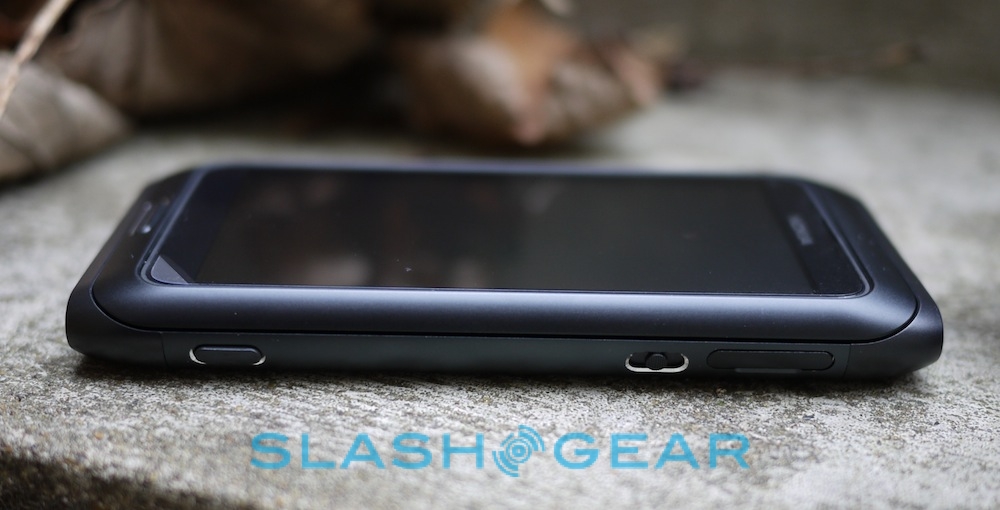 Controls are limited to a power/profile button on the top edge (in-between the HDMI and 3.5mm headphones ports), a volume rocker and camera shortcut on the right edge, and a lock switch on the left edge. All are beautifully bevelled, the silver aluminum glinting against the matte black finish. A backlit home/menu button sits underneath the 4-inch capacitive touchscreen. That display runs at an underwhelming 640 x 360 resolution – given the size, the pixels are clearly discernible – but the quality of the 16m color AMOLED panel, using Nokia's Clear Black branded technology, is almost enough to make us forgive the pixel shortage. Colors are rich, blacks inky and the E7 holds its own on all but resolution when put next to a Samsung Super AMOLED screen.