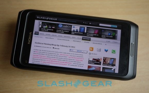 The E7 runs Symbian^3, the same PR1.1 release as just made public for the N8, though of course renamed PR1.0 for the newer device. That makes it instantly familiar to existing users, but also means it faces the same uphill struggle to convince would-be buyers that Symbian remains competitive in the face of Android, iOS and other platforms.