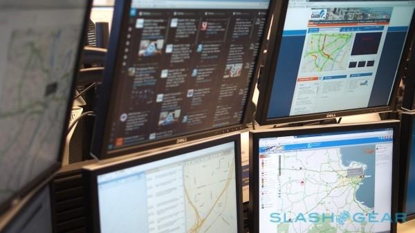 Each workstation has a cluster of six displays, with extra panels in-between that can be used for overflow. What each screen shows depends on the location and the operator's own preferences, but can range from official state traffic sites, webcams showing live feeds from highways, email for receiving alerts and tips, and several Twitter pages.
