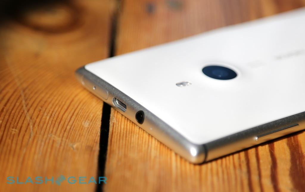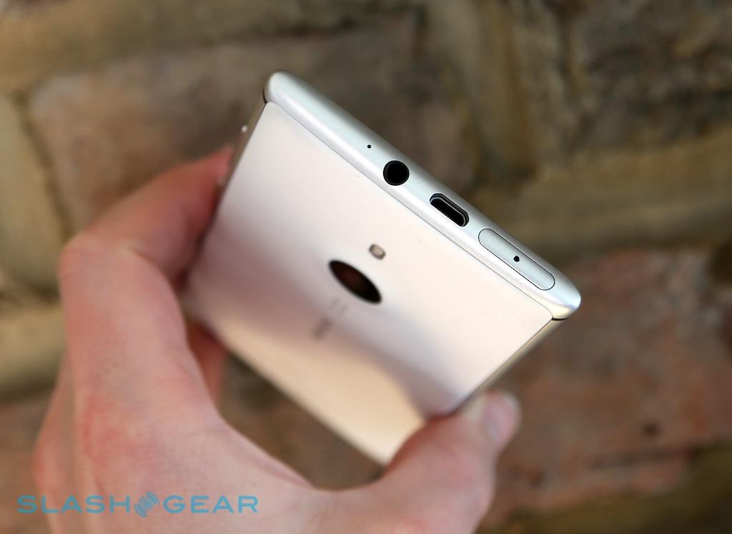 On top, like a meniscus bubble of liquid, is the toughened glass display, unmarked aside from the earpiece notch, Nokia's logo, and the three touch-sensitive buttons under the 4.5-inch screen. The only physical controls run down the right edge, narrow slivers of metal that have good tactile feel, while the top edge has the microSIM tray, a 3.5mm headphone jack, and a microUSB port.