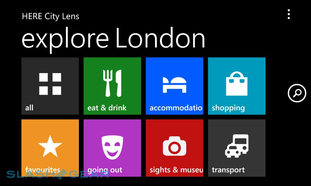 Finally, there's HERE City Lens, which is Nokia's stab at augmented reality. The concept is one of discovery: you can choose from a category, such as "eat & drink", "shopping", or "transport", or show all of the potential attractions, and by holding the Lumia 925 up see their location float over a view of the real world from the camera. Tapping an individual record brings up its address, physical distance away and an option to get directions, and the ability to share it or see more information.