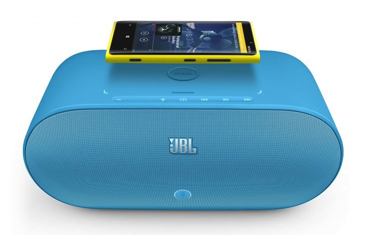 First we'll start with the just announced JBL Power Up wireless speaker. This new speaker doesn't have a dock, well, because it doesn't need one. This is as wireless as it gets featuring both NFC capabilities for wireless media playback, and wireless charging with compatible Lumia devices too. JBL partnered with Lumia and the Qi wireless technology to produce a neat accessory here. Just tap the phone and speaker together for some NFC goodness to start streaming your favorite song, or lay your Lumia right on top and charge it at the same time. This is quite the cord-cutting accessory.