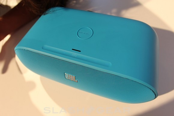 First we'll start with the just announced JBL Power Up wireless speaker. This new speaker doesn't have a dock, well, because it doesn't need one. This is as wireless as it gets featuring both NFC capabilities for wireless media playback, and wireless charging with compatible Lumia devices too. JBL partnered with Lumia and the Qi wireless technology to produce a neat accessory here. Just tap the phone and speaker together for some NFC goodness to start streaming your favorite song, or lay your Lumia right on top and charge it at the same time. This is quite the cord-cutting accessory.