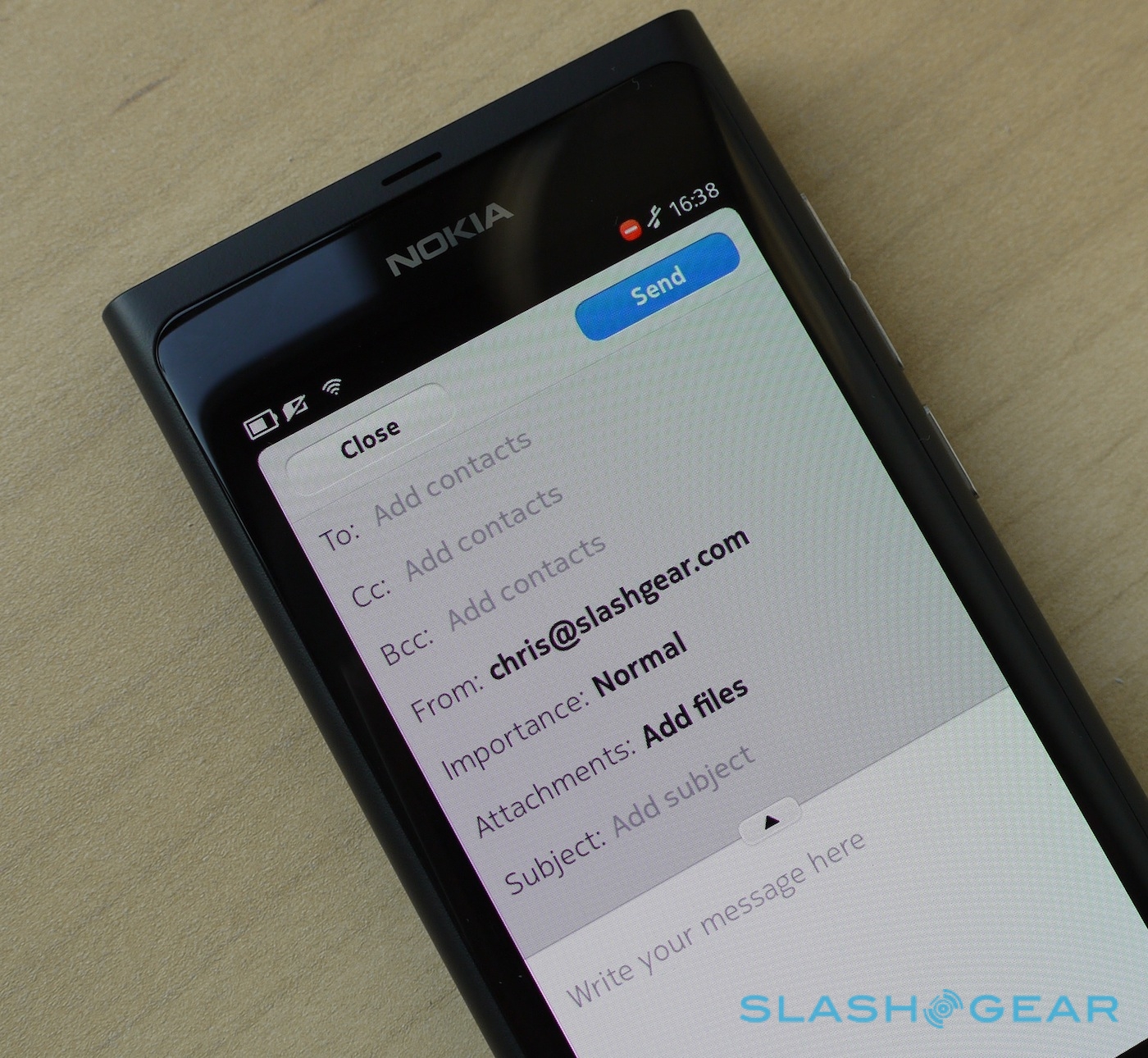 Then there are the less obvious elements, which help add to MeeGo's sense of depth. When locked, the N9 shows a dim white clock – the low-power benefits of AMOLED allowing it to stay active for this all the time, without draining the battery – and some notification icons, such as "@" when you have new emails. You can reach the regular lock screen by pressing the physical button on the side, but alternatively a brisk double-tap on the touchscreen takes you there too. From there you can see just how many emails you have, along with a preview of the latest; a swipe in any direction unlocks the phone.