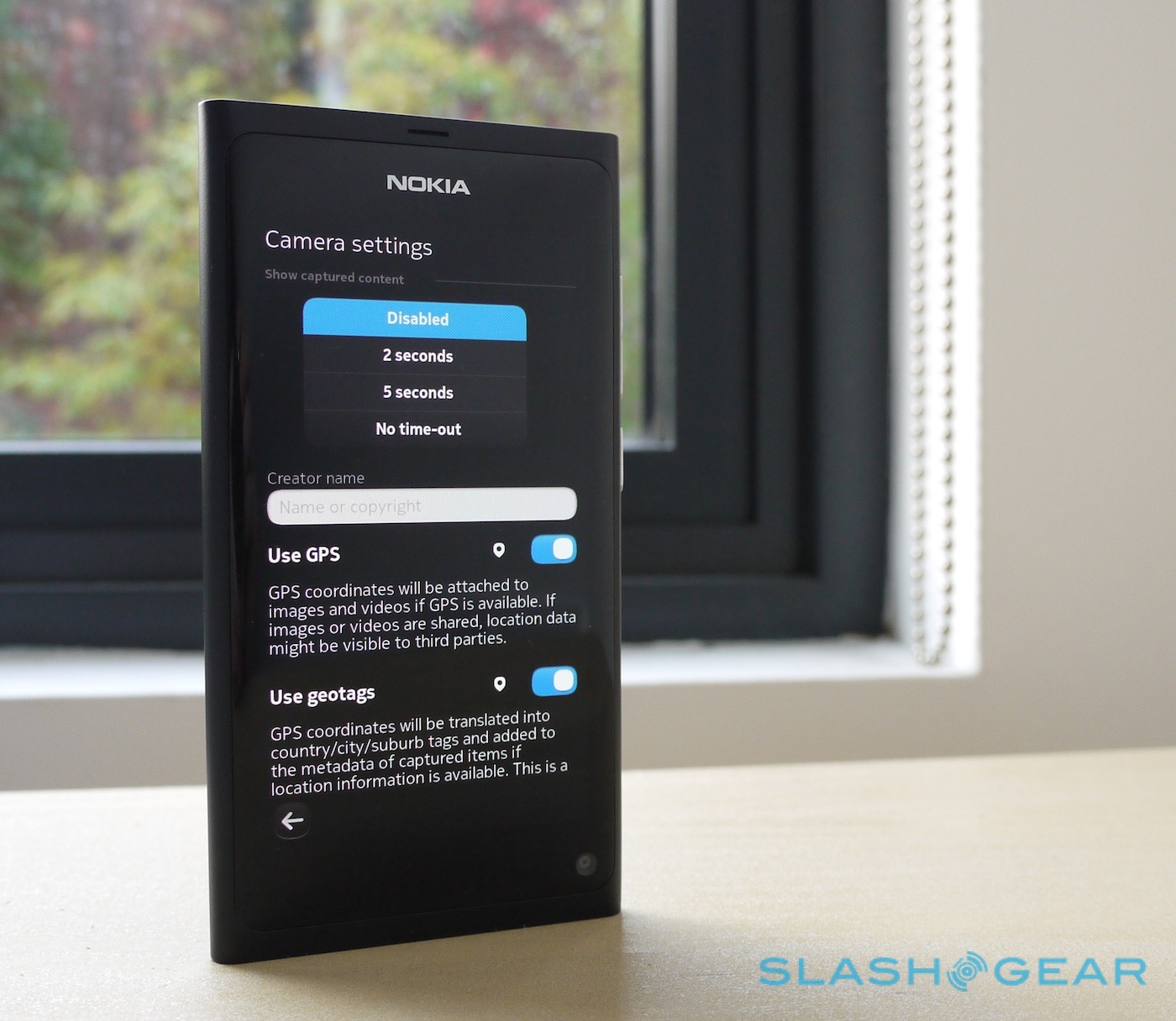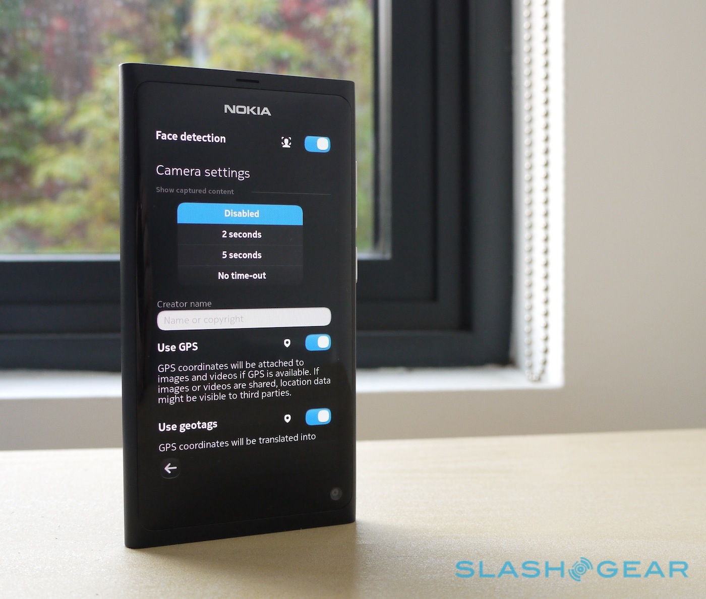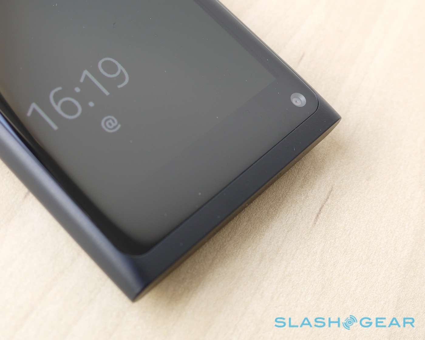 Nokia has given the N9 two cameras, an 8-megapixel autofocus unit on the back with a dual-LED flash and Carl Zeiss optics, and a front-facing camera. Unusually, this front-facer is in the bottom right corner of the display, rather than somewhere at the top, likely for reasons of internal construction rather than anything else. Doubly-odd, there's no actual way to access it, at least using the camera app Nokia preloads. On the bottom edge is a speaker with a surprising amount of volume and body to it.