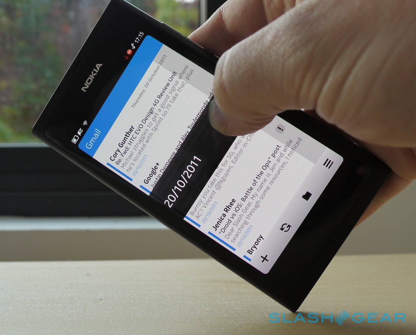 Nokia doesn't stint on preloaded applications with MeeGo: the N9 comes out of the box with just about everything you'd expect from a recent smartphone. Email supports Exchange, Gmail (though not with push), and any IMAP/POP account you might have, served up in a universal inbox. There's no conversational view, unlike on Android, though you can pinch-zoom to get in close to attached photos and text. Begin scrolling and a shadow scrollbar appears down the right hand side: drag it, and you can easily jump down the list by date. Up to a week's worth of messages are synchronized, and the dedicated Search app includes those – though not what's still on the email server – among its queries.