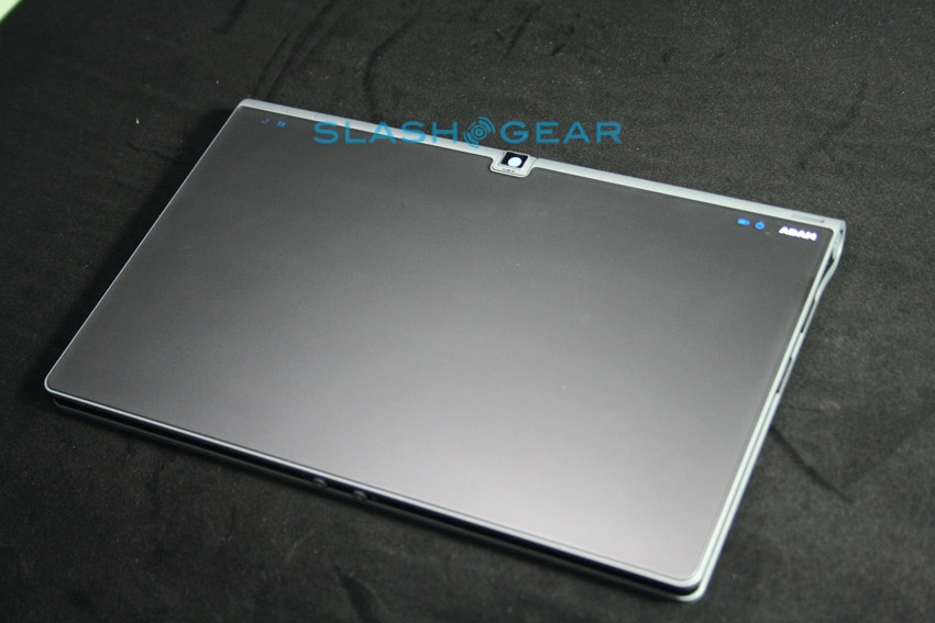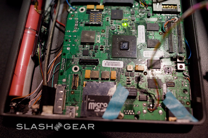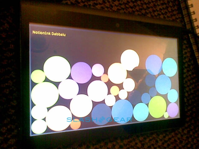 You may also have read that Notion Ink have a new 3-megapixel camera with a patented swivel action, and we're excited to be able to show you the first live pictures of that. Where in other photos we've seen the company discretely covering the assembly with their hand, or even showing a second prototype without it installed, here you can see the rotating camera barrel which allows you to flip the camera from front to back. The design means you can both use the Adam for video calling and for regular photography, and saves the cost and bulk of two sets of optics. On the back there's also a trackpad used – like we've seen in a far smaller way on the Motorola Backflip – to navigate without leaving smudges on the display. Initially the trackpad is 1:1 mapped to the screen, so you can tap and have the cursor show up exactly in the region you want it to; then it works as a regular trackpad, scrolling the cursor around and tapping to select.