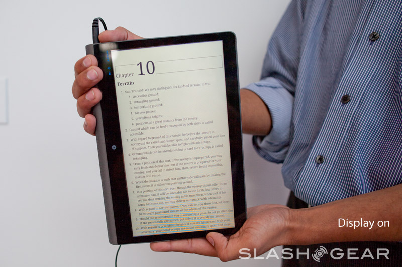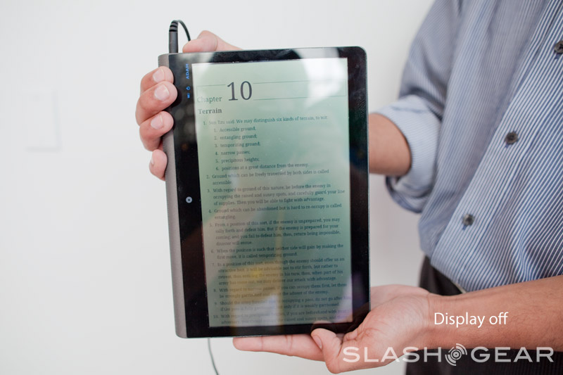 Pixel Qi's technology means you can operate the display in two different modes: as full color LCD for use indoors or in a low-power reflective mode that actually gets brighter the more direct sunlight falls upon it. This latter mode is comparable to E Ink in its appearance, but Pixel Qi can still show smooth, responsive video (and slightly muted colors). Users will be able to manually switch the backlighting on or off, or leave it set to automatic and have the Adam toggle it itself. Notion Ink also offered to take the Adam out into direct sunlight so MMtech Online could exclusively see the screen performance there.