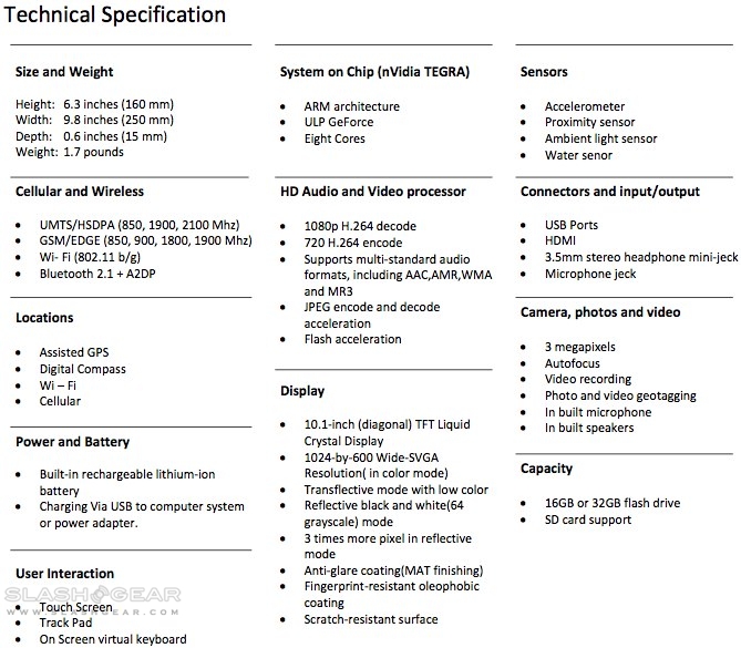 The Notion Ink smartpad measures 6.3 x 9.8 x 0.6 inches and weighs 1.7lbs; as well as the triband (850/1900/2100) UMTS/HSDPA, WiFi b/g and Bluetooth 2.1+EDR it also squeezes in A-GPS, a digital compass, accelerometer and proximity, ambient light and water sensors. Connectivity includes USB, HDMI, a 3.5mm headphone jack and a microphone input, and there's also a 3-megapixel autofocus camera with video recording support. Onboard storage is either 16GB or 32GB of SSD, and there's an SD slot for augmenting that.