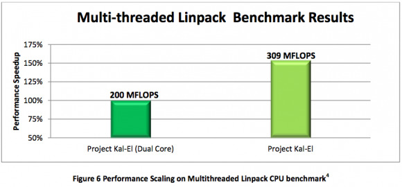 Linpack is another benchmark the folks at NVIDIA run, here showing the difference between, interestingly enough, a dual core Project Kal-El processor and a full quad core processor (with, again, all four cores turned on instead of just the two.) You'll find that the quad core processor wins by another long-shot.