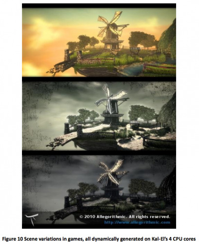 One example of not needing all the information loaded by your game each time it loads is this: while the Windmill game (pictured above) generates texturess and racks up a 300 MB data limit, all of this using only a 900 KB base texture set. This means that a game capable of delivering 300 MB of graphics can also have those graphics, as they're generated, with only 1 MB to start when you pick the device up from the store. What store would that be? We'll see soon enough!