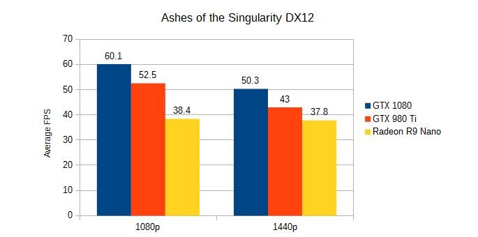 Ashes of the Singularity is one of the few DirectX 12 titles currently available, with a built-in benchmarking tool. This RTS often features many units on the screen at once, all engaged in combat. It can be very demanding on the GPU, which makes it perfect for benchmarking. For our tests, we cranked up the settings to "Crazy" which is the highest that they'll go. We tested each card in both 1080p and 1440p.