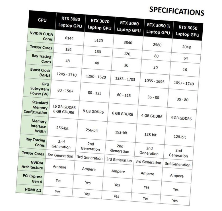 They still have 5th gen NVIDIA Encoders, 7th gen NVIDIA Decoders, access to HDMI 2.1, PCI Express Gen 4, Ampere architecture, 3rd gen Tensor Cores, 2nd gen Ray Tracing cores. These details are the same for all RTX 30 laptop GPU releases so far. It's the amount of cores and power and memory that's ever-so-slightly different between GPU units.