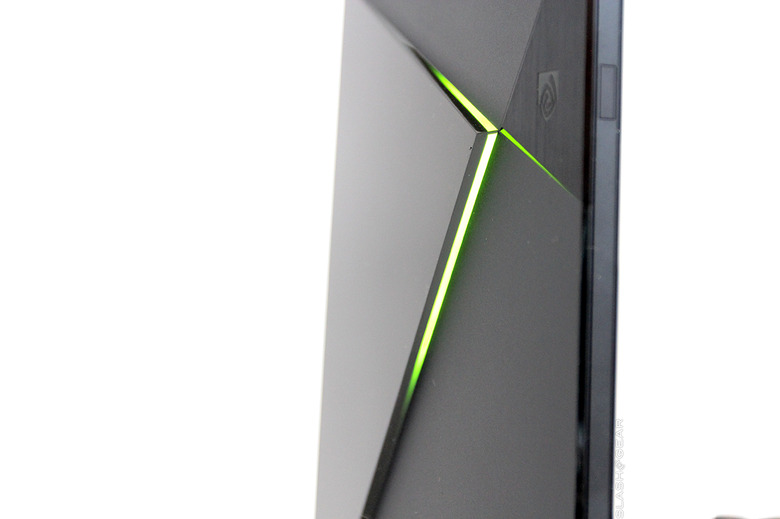 The NVIDIA SHIELD Android TV unit is roughly rectangular with some lovely triangular shapes raised from its side, revealing an "Edge" with NVIDIA Green light inside. You can choose to dim this light from inside the system, but you probably wont want to.
