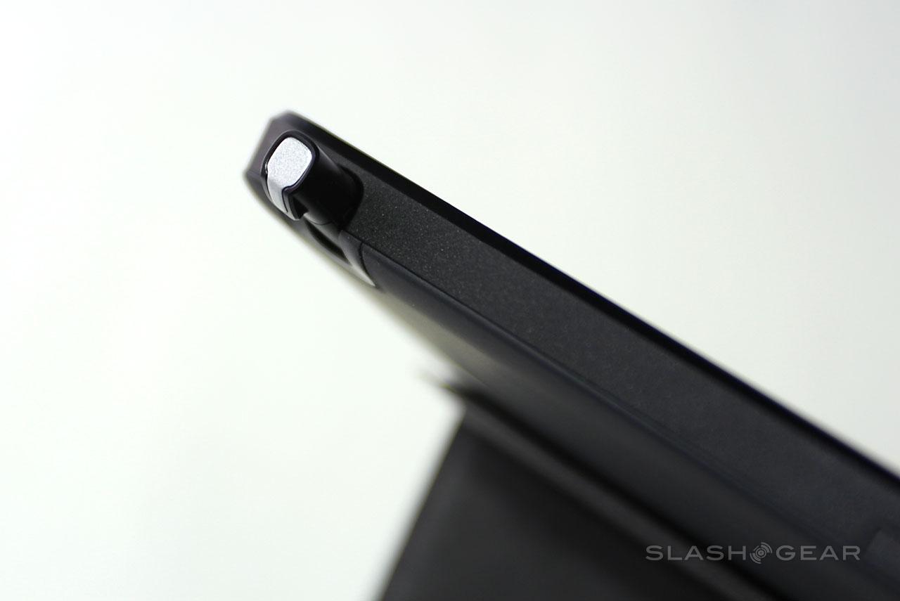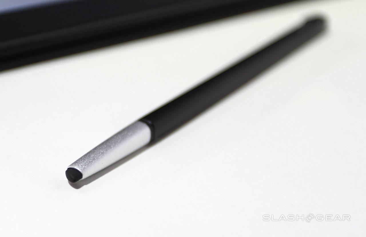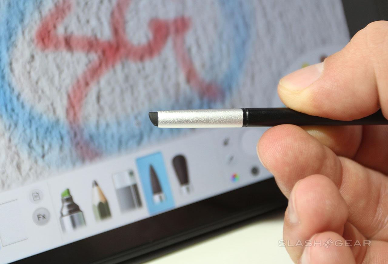 NVIDIA's DirectStylus 2 is arguably a similar compromise, but it's a clever one. The pen itself is regular plastic with an angled rubber tip, and the magic is all in the software and algorithms. Running the touch processing through the Tegra K1 means it's able to differentiate in real-time between the nib, your fingers, and your palm resting on the display. DirectStylus 2 can even feign pressure sensitivity, by measuring the contact point as the tip deforms against the screen.