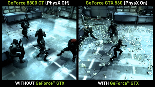 At 41 seconds in, you'll see a "fully functional steel mill" which without GeForce GTX has only canned animations. With GeForce GTX activated, your CUDA Cores create hundreds of shiny particles that not only bounce off surfaces all around, they bounce off yours and the computer's characters as well.