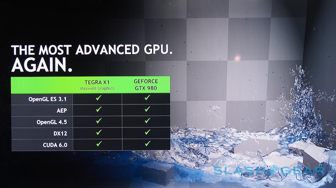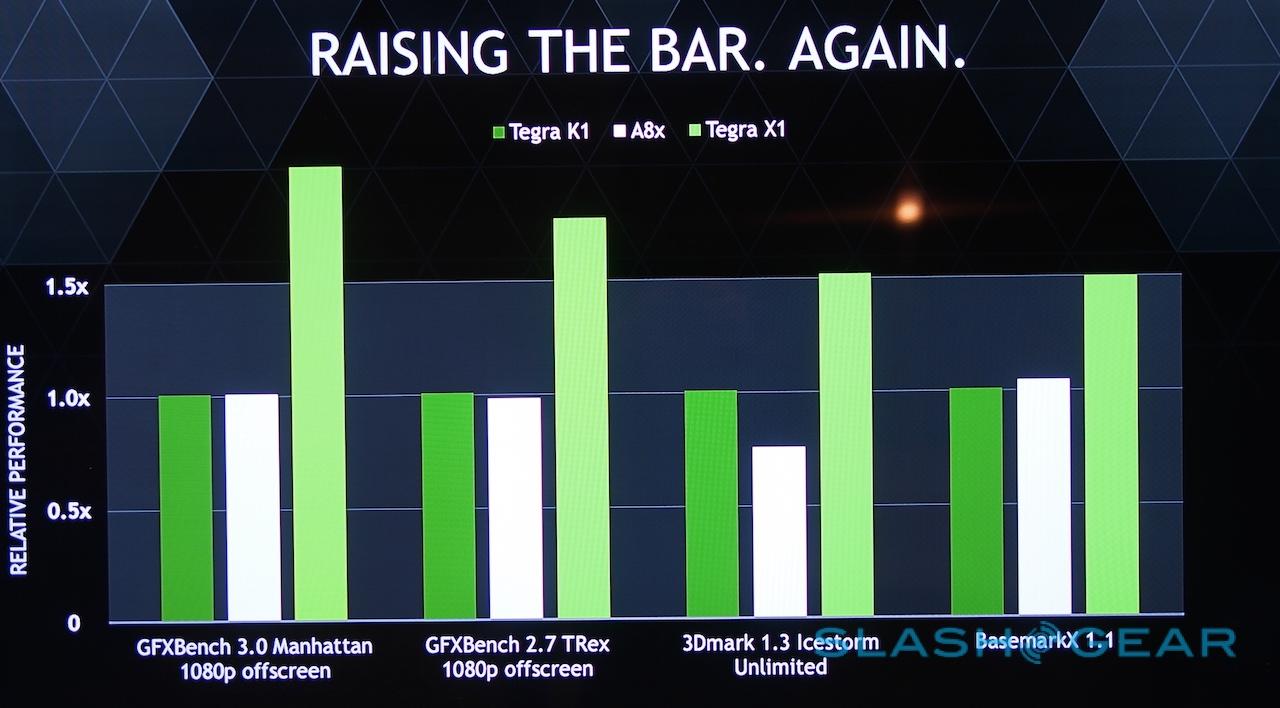 So, for about the same power consumption, the Tegra X1 will offer roughly double the performance of the K1. Throttled back to match the graphics performance of Apple's A8x in the iPad Air 2, meanwhile, the X1 supposedly delivers 1.7x the power efficiency.