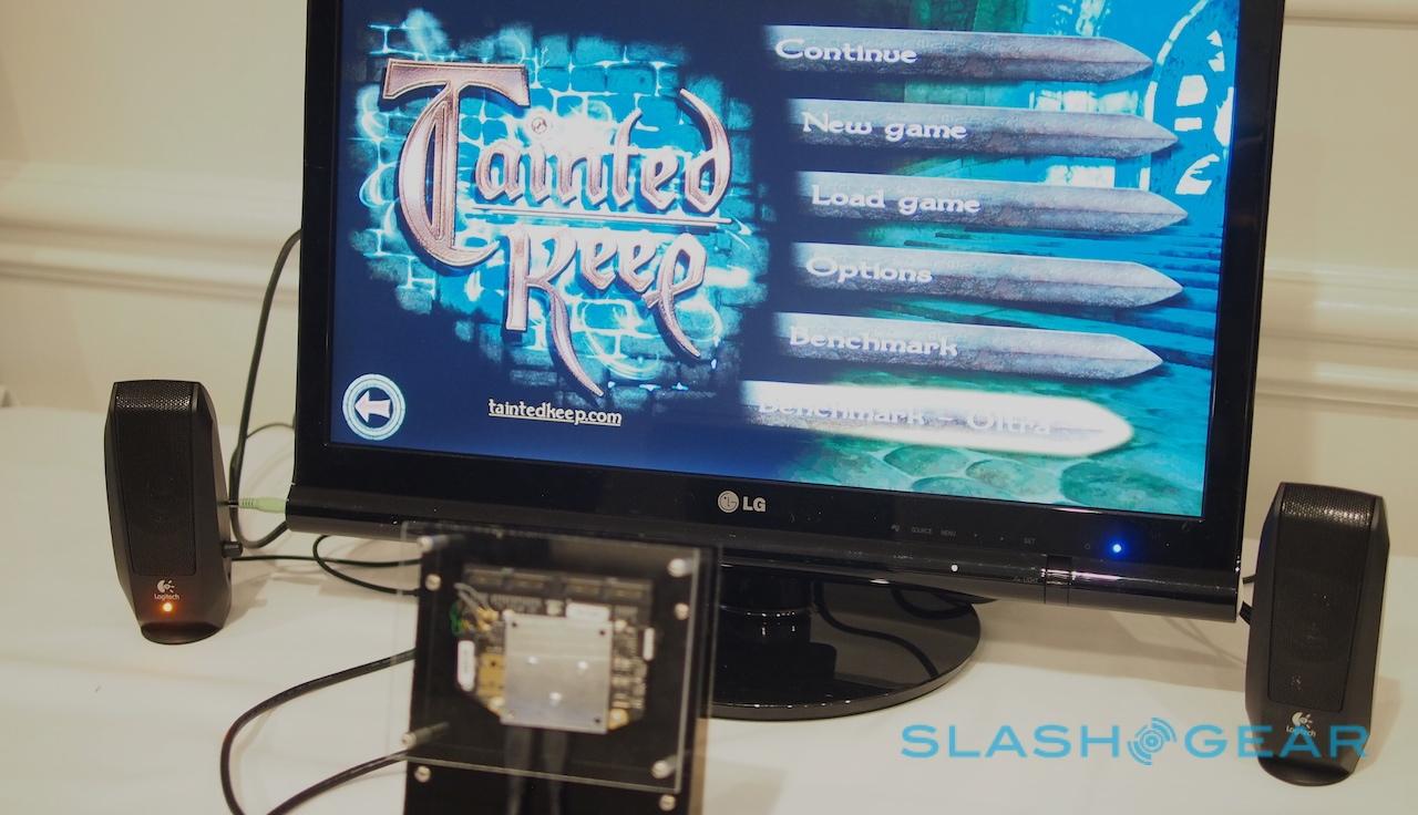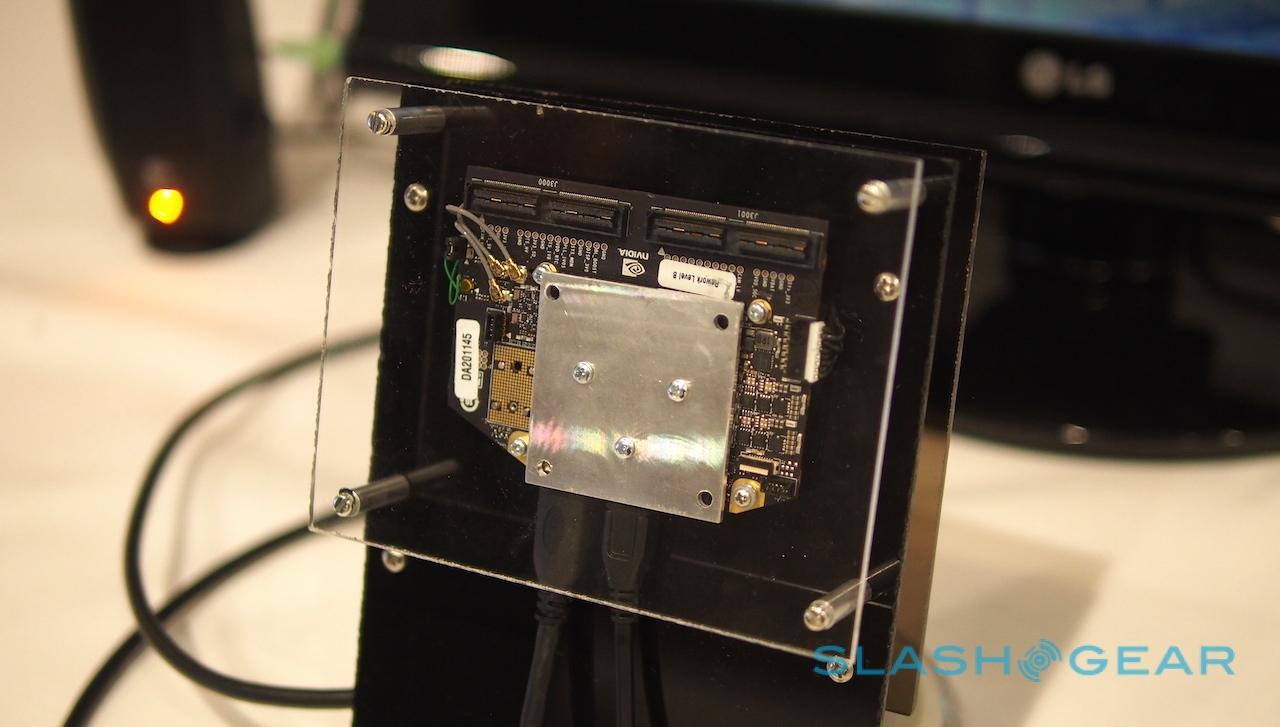 NVIDIA's reference board is as you'd expect: a postcard-sized slab with the basics to get manufacturers going. For the benchmark demonstration, the engineers had bolted a heatsink to it to replicate the sort of cooling prowess an average tablet would have.