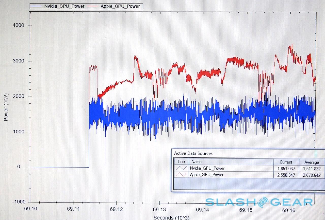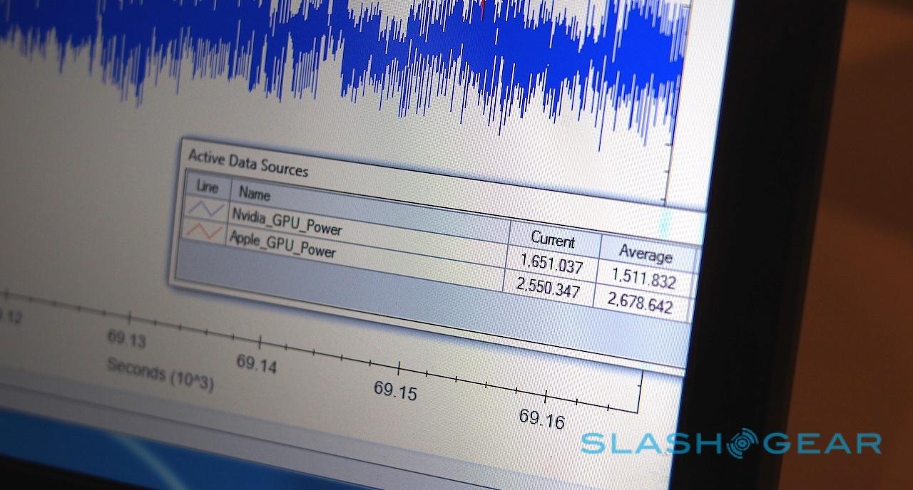 By yanking off the rear, and isolating the iPad's GPU, NVIDIA was able to measure what power the A8x used as it ran the same benchmarks as the Tegra X1. Both vary considerably, as the graphics chips ramp up and down, but the upshot is that the X1 sips far less juice overall.