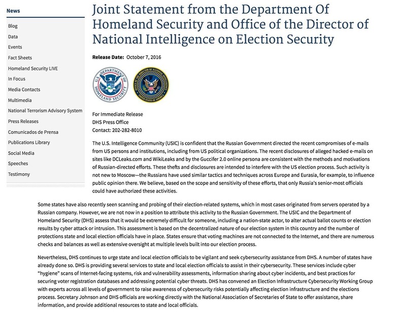 Schultz mentions a report from the Department of Homeland Security and Office of the Director of National Intelligence on Election Security. That statement can be found at the Department of Homeland Security website and in a screen capture inserted below.