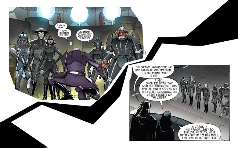 In perhaps the most essential comic series in the Star Wars universe right this minute, Darth Vader: Dark Lord of the Sith, we see the timeline's earliest Inquisitor (as shown above and below). It is here, in the year 19 BBY, that Revenge of the Sith takes place and The Emperor introduces Darth Vader to the newly formed Inquisitorious.