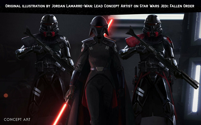 The image used in the Making Star Wars article by Ward (as seen above) is a concept art illustration from Jordan Lamarre-Wan (see: Art Station source), Lead Concept Artist on Star Wars Jedi: Fallen Order. There, too, is a healthy point of reference for the Inquisitorious. In Fallen Order, we're seeing Darth Vader's Inquisitors dispatched to hunt a suspected force user Cal Kestis – this takes place in 14 BBY.