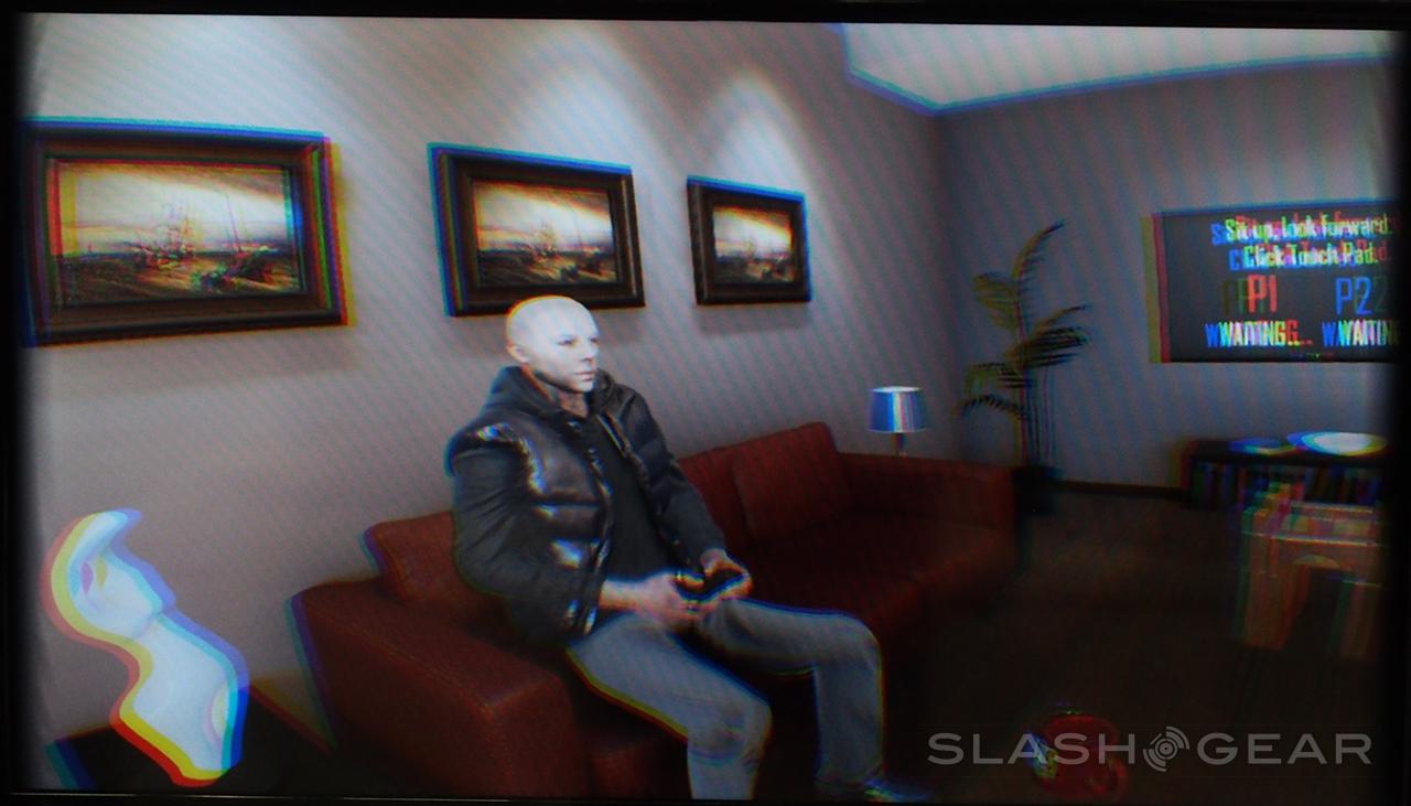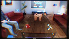 These little knights run around a room – fully furnished – while you sit on a couch and control. Another player sits at another couch, controlling one of the knights while you control yours, fighting one another. You can see your (virtual) self and your friend's (virtual) self while you control your player on a tabletop.