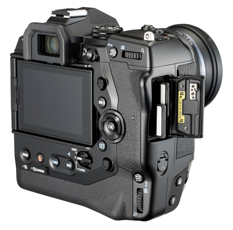 All of these features would be for naught if the camera was prone to dying in the middle of a shoot. Fortunately, the OD-M E-M1X is reliable in that sense, too, with a dual battery system for two BLH-1 lithium-ion packs. It's designed so that they can be inserted or removed even while the camera is attached to a tripod. When it comes time to charge up, though, you don't even have to remove them from the body, thanks to support for the 100-watt USB-C Power Delivery standard.