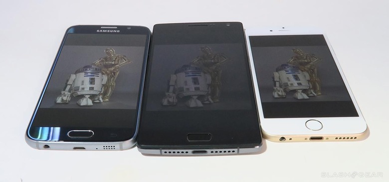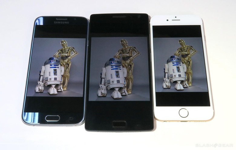 Above and below are the same devices (Samsung Galaxy S6, OnePlus 2, iPhone 6) with the same brightness and the same images on their displays.