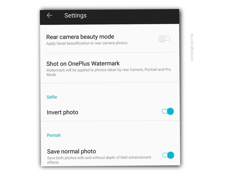 The built-in camera app has a set of options that are semi-hidden, sorta, kinda. In this menu you'll be able to decide on storing location data, toggling the shutter sound, Quick Capture, and adding (or removing) a OnePlus watermark to or from your photos. To get here, head to Camera – swipe up – tap cog icon in upper-right.