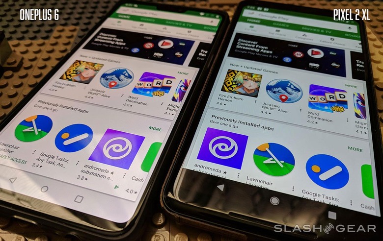 Below you'll see the OnePlus 6 and a Google Pixel 2 XL right next to one-another. Pixel 2 XL has a 6-inch display with 1440 x 2880 pixels for a 538PPI pixel density. OnePlus 6 has a 6.28-inch display with 1080 x 2280 pixels for a 402PPI pixel density.