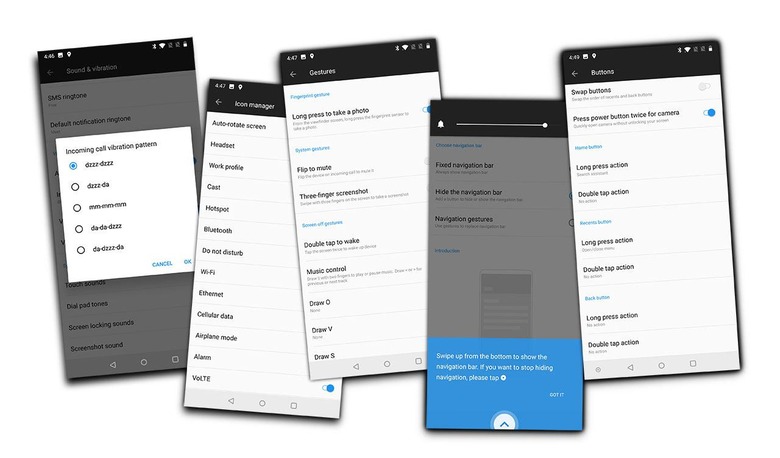 We've got the ability to move the home row of navigation buttons off the screen automatically. There's a button that allows you to make the home row stick. You can set shortcuts for different kinds of taps and presses for all home row navigation buttons; the user can double-tap the display to wake. Users can draw ll with two fingers to play or pause music, or draw arrows to move between tracks – helpful whilst in the car, needing to keep one's eyes on the road. Users can draw an O, V, or S for other actions as well. This phone has Flip to Mute as well as Three-finger snapshot.