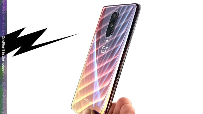 The OnePlus 8 we've got here is the unlocked Interstellar Glow edition. That's one you'll be able to purchase directly from OnePlus online. This device has three camera lenses on its back alongside a pair of LED lights for flash.