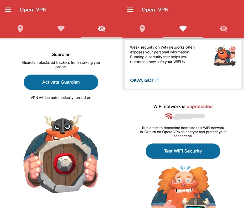 The app is split into three simple screens: one for turning on the VPN, one for testing WiFi network security, and one for blocking ad trackers. You don't have to create an account to use the app. Once the VPN is activated, you'll be browsing the web with a little more anonymity and may be able to get around certain blocks or region locks that otherwise plague your Internet activities.