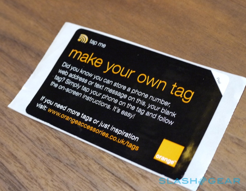 Orange will also be pushing NFC tags, which can prompt the phone to either open a new SMS with the number and a message preconfigured (the carrier plans to use it with its "Orange Wednesdays" movie deal), load a phone number ready to be dialed, or open an URL. That way you could top up your phone's credit simply by holding a tag near it, or get information on a film or concert by holding the phone up to a poster. A user-programmable tag will also be supplied: the phone offers to program it with a number, message or URL.