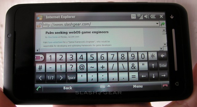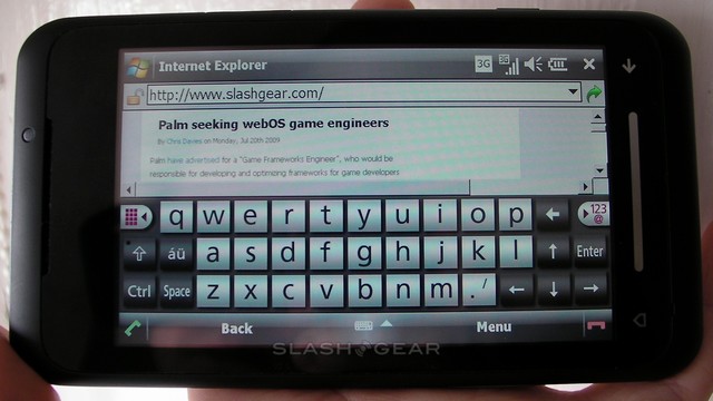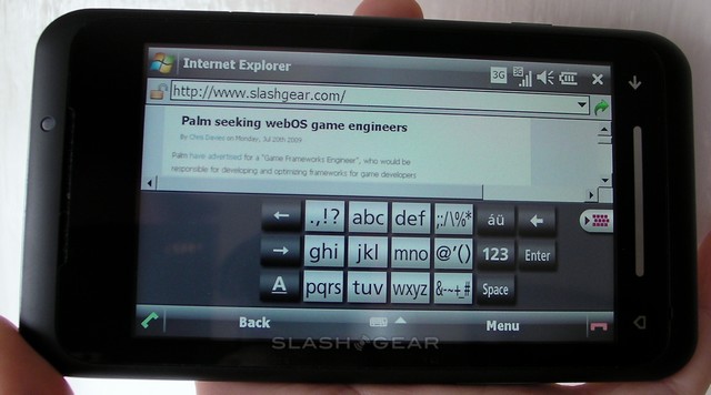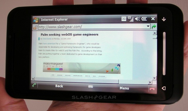 We had high hopes for the TG01's performance as a web browsing device, and were disappointed to see that Toshiba failed to offer anything other than the basic Internet Explorer Mobile 6. Having been spoilt with Opera Mobile on HTC devices, we didn't hold our breath with for IEM6; however, with a few tweaks (primarily to ensure you see desktop webpages, rather than their mobile versions) it's actually pretty usable. Rendering is quick and, once you've trained yourself to tap firmly on the resistive touchscreen, dragging around pages is impressively smooth. There's also Flash support, so YouTube video loads in-page and plays with no issues, though some sites did warn us that the version of Flash offered was insufficient for their content.