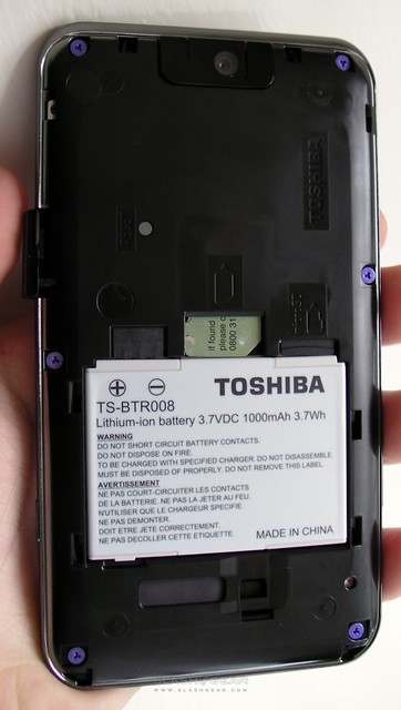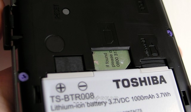 We'd recommend a set of Bluetooth headphones for use with the TG01, unless you're a very careful user indeed. Since there's no standard 3.5mm headphone socket, you're forced to use the Toshiba adapter or the supplied headset which both plug into the micro USB port on the side. The adapter does, at least, have a microphone and control button, together with a socket for your favorite headphones, but both it and the Toshiba headset seem precarious and destined to snap, protruding as they do from the side of the phone. What's a wide device to start with gets even wider: almost 10cm across with the adapter plugged in. Happily audio quality is decent, though the supplied headset is as uninspiring as such included accessories usually are.
