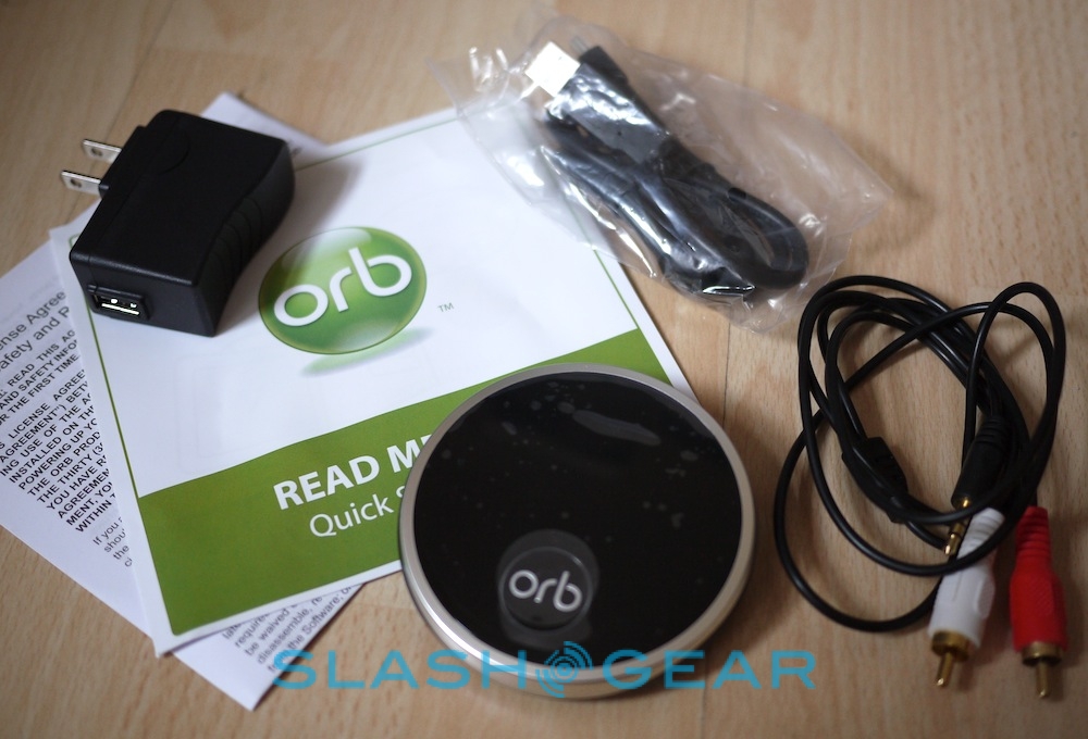 Inside there's WiFi b/g/n, and in the box Orb include an AC USB power supply, a USB to miniUSB cable and a 3.5mm stereo audio cable. There's also a brief "Getting Started" sheet and the warranty information.
