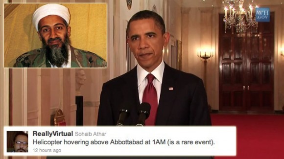 The reports of Osama bin Laden's death may be ubiquitous now, but the story inadvertently broke – and played out amid the firefight – on Twitter first. Abbottabad resident Sohaib Athar noted a "Helicopter hovering above Abbottabad at 1AM (is a rare event)" and then "A huge window shaking bang here in Abbottabad Cantt. I hope its not the start of something nasty :-S" without realizing he was giving an on-the-ground insight into what the US government has described as a 40-minute "surgical raid".