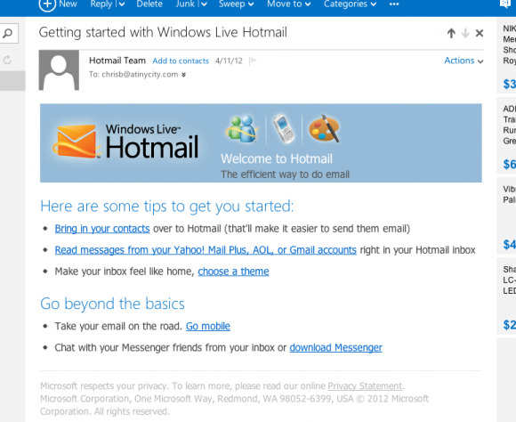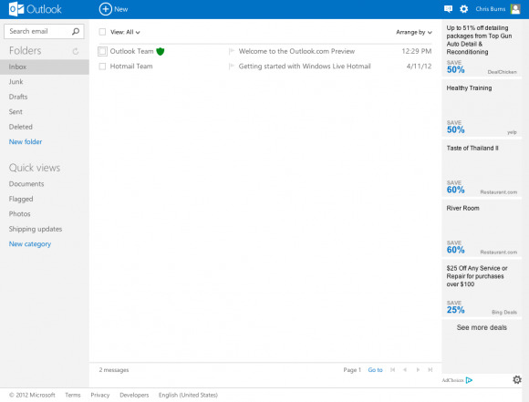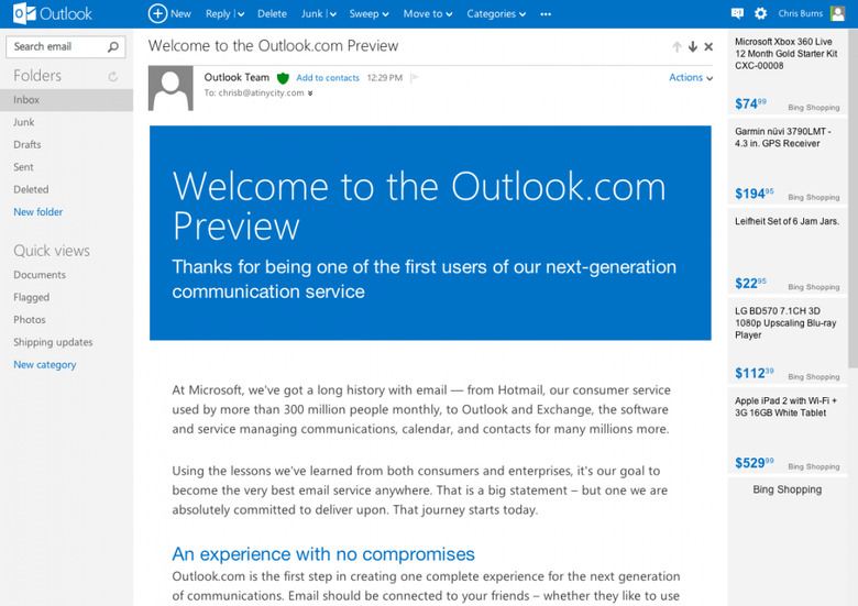 The whole layout is rather respectful to the eyes, and the only piece of baggage the whole system carries over from the old world of email is the set of Bing Shopping ads that sit on the right. We'll have to see how we can... deal with those soon. Skype for video chat will be popping up too, we're sure, so stick around for the updates as they happen.