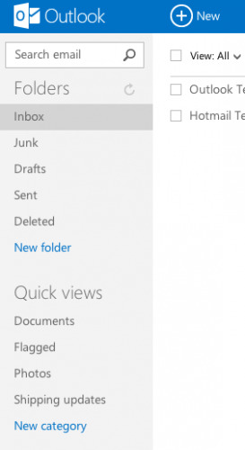 Up on top you've got the Outlook name and logo, a + New button to start up a new email, and all the way on the right you've got Messaging (which connects with Facebook), settings, and a quick-link to your profile – and more account settings too. The fact that this profile link and settings are up in the upper-right-hand corner should be setting off some bells for Google. It's a little too familiar, and we're sure Google will have a bit to say about it soon as well.