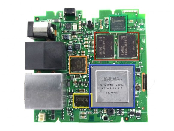 Inside the iFixit teardown the innards promised by the manufacturers of the OUYA, including – but not limited to – the NVIDIA Tegra 3 quad-core processor with 4-PLUS-1 technology (meaning there's 5 CPU cores, not just 4). Under the hood two Samsung 4Gb DD3 SDRAM modules sit next to one another, these two 4Gb modules together creating 1GB total.