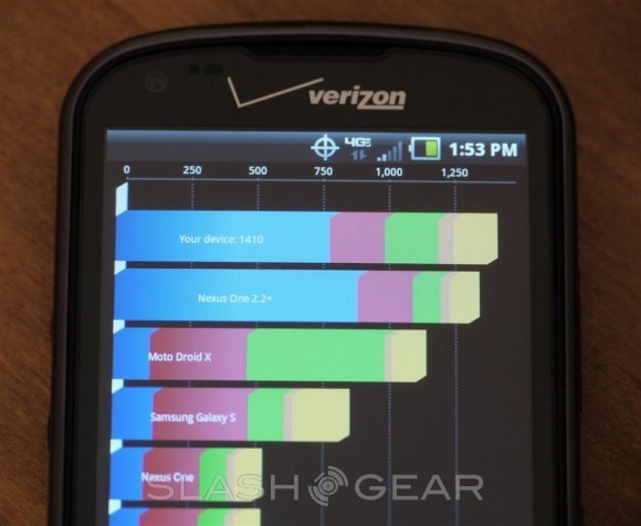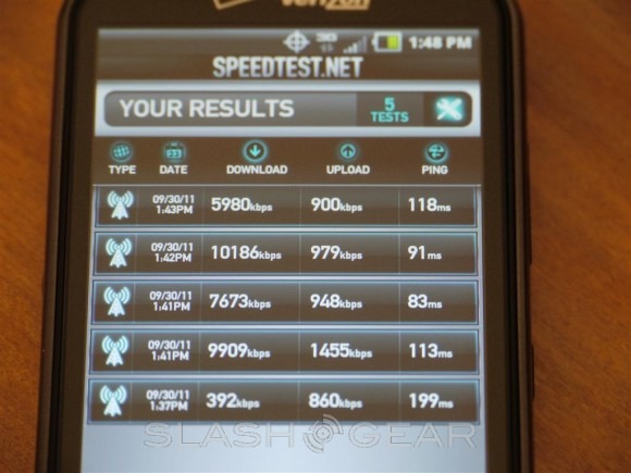 Like mentioned above we have a 1.0 GHz single-core processor, 512MB of RAM and 4G LTE. This next set of pictures tests both the device performance with Quadrant, as well as a few speedtest runs to see how Pantech handles the Verizon 4G LTE network. Given the internal specs the Pantech Breakout performs right on track with something like the Nexus One. With a Qualcomm Snapdragon processor and all. We saw Quadrant Advanced sit around 1400 — give or take a few. Again, no dual-core here but for the price this smartphone rocks compared to other similarly priced phones on the market.