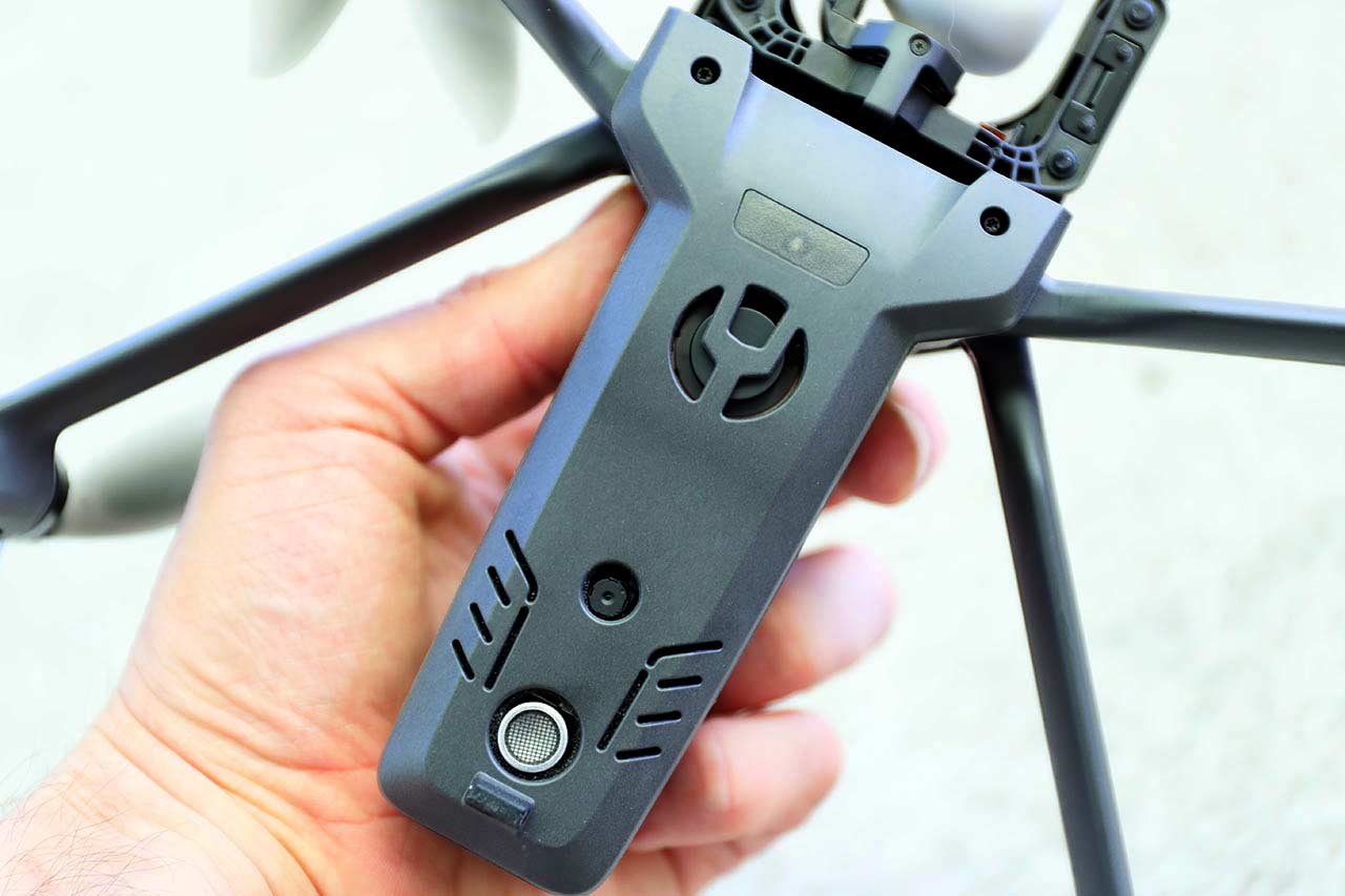 Because of the way this drone sets its camera out and away from any block, it's able to tilt a full 180-degrees up and down. The drone has 3-axis hybrid stabilization – that's 2-axis roll/tilt angles and EIS: 3-axis roll/pan/tilt angles.