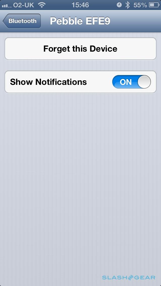 To actually control the notifications iOS sends through, you have to turn to the iPhone's Notifications page. There's no specific mention of Pebble there, but if you switch the individual notifications you want routed to the watch off, and then on again, they start to pop up on the watch's display. It's hardly an intuitive system, but it's one you soon get used to doing: as it stands, every time you disconnect the Bluetooth connection and then reconnect it – say, if you walk out of range of your phone as it charges on your desk – you'll need to go through the same off/on toggling process to get the alerts pushed through again.