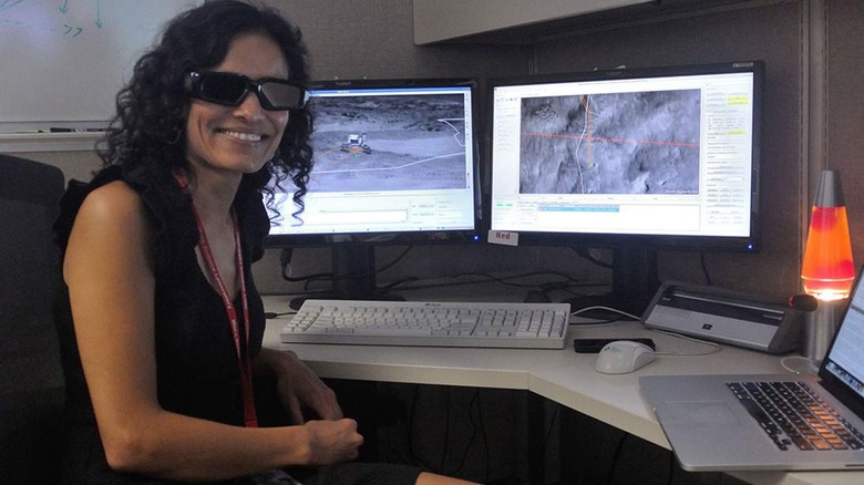 The Perseverance rover has an integrated auto-navigation system called AutoNav. The system makes 3D maps of the terrain ahead, identifying hazards and planning a route around any obstacles without requiring data from controllers on Earth. Senior engineer, rover planner, and driver for NASA Vandi Verma (seen in the image below) says that the rover has a capability called "thinking while driving," meaning the rover is thinking about the autonomous drive while its wheels are turning.