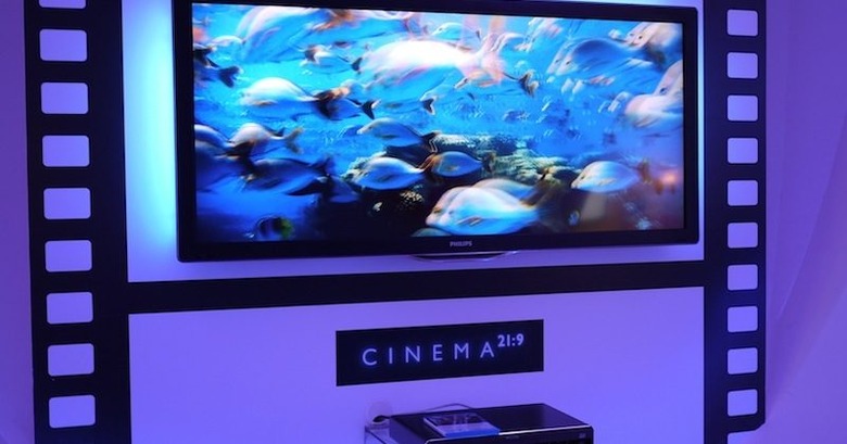 The concept behind 3D Cinema 21:9 remains the same: rather than having true cinema-scale content be sandwiched between black bars, even on 16:9 widescreen TVs, the Philips' set is properly sized for films. That makes for an enormous, broad picture, that still manages to be impressive even among the huge scale HDTVs you see at shows like these.
